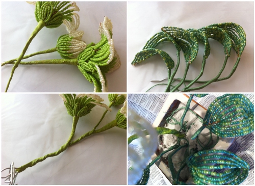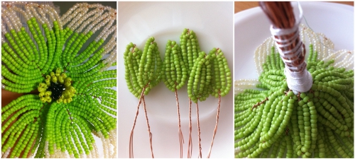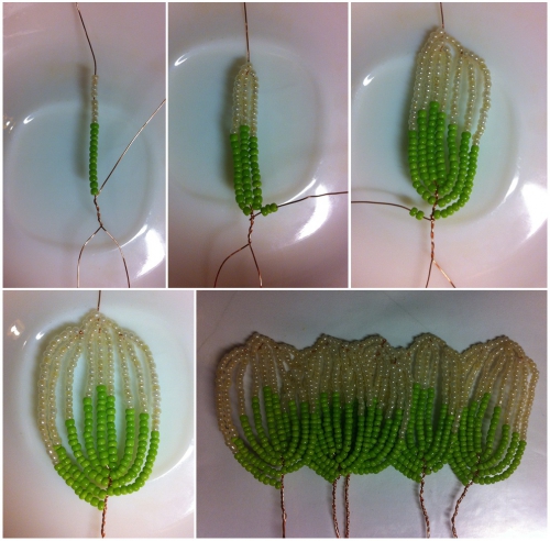 Бутон виготовляється з бісеру двох кольорів білого і світло зеленого, тому низьку не готуємо, а відрізаємо дріт на довжину близько 70-80 см. Дотримуючись основної схеми, готуємо вісь з 7 зелених і 7 білих бісерін. Дріт і вісь перекручуємо. Потім починаємо виплітати дуги – при цьому кількість зелених та білих бісерін варіюється в різних пропорціях (див. фото нижче). Кут між віссю і низькою повинен становити 45 градусів. Таким чином, робимо 3 дуги. Готовому листу надаємо гостру форму. Дріт в вершині листа (вісь) акуратно подгибается і обрізається.