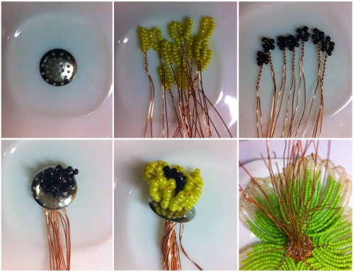 Тичинки виконані в техніці петельного плетіння. На відрізку дроту довжиною 15 – 20 см. посередині робимо одну петлю. Петлі чорної тичинки складаються з 5 бісерін, жовтої – з 12 бісерин. Для двох квіток нам необхідно підготувати 14 чорних і 24 жовтих тичинок.